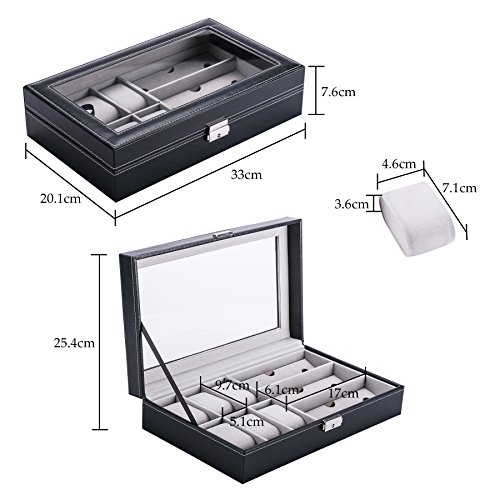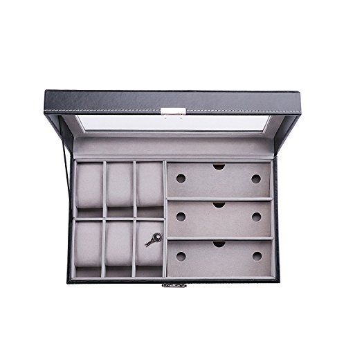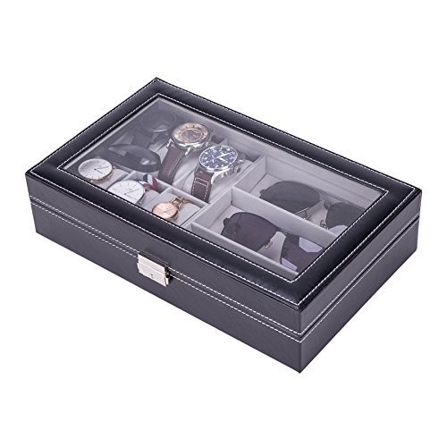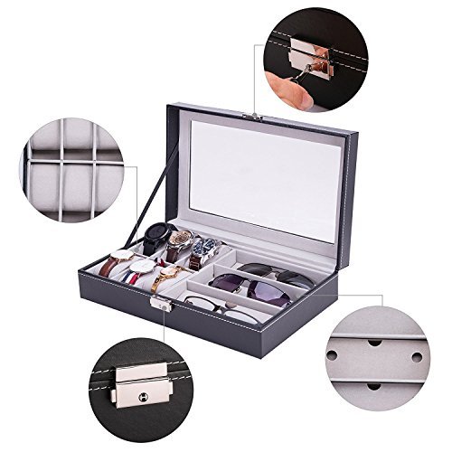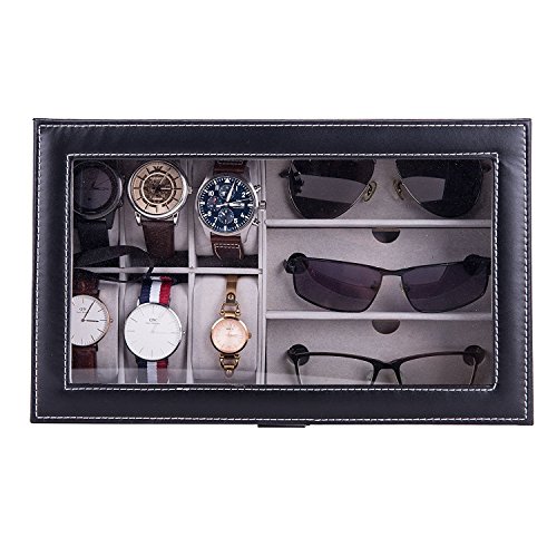 Display and preserve your favorite timepieces with this 6 watch-slots & 3 sunglass-grids box. The PU leather exterior with window protects sensitive watches and jewelry from dust and moisture while allowing for convenient admiration. Rest your belongings on the abrasion-free cushion interior and enjoy.