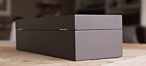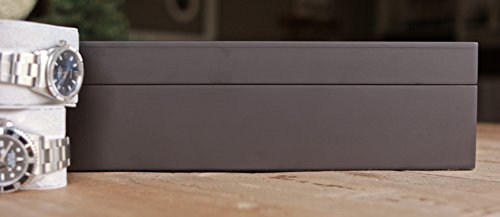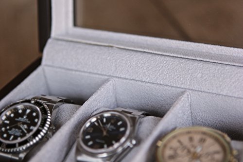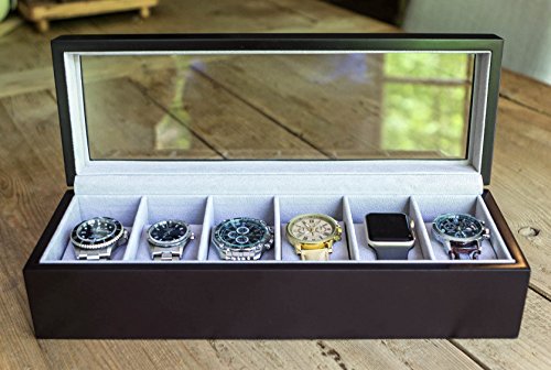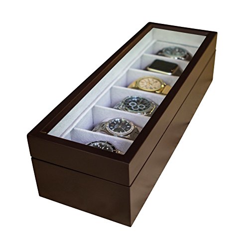You will admire up to six fine timepieces through the real glass top. Your choice of natural dark espresso-finished or sustainable, light pine wood will easily fit on a dresser top, shelf or some other great vantage point in your home or office. Changing styles is easy because the hinged lid will stay up as long as you need, and when you close it, embedded magnets assure the lid stays in place.